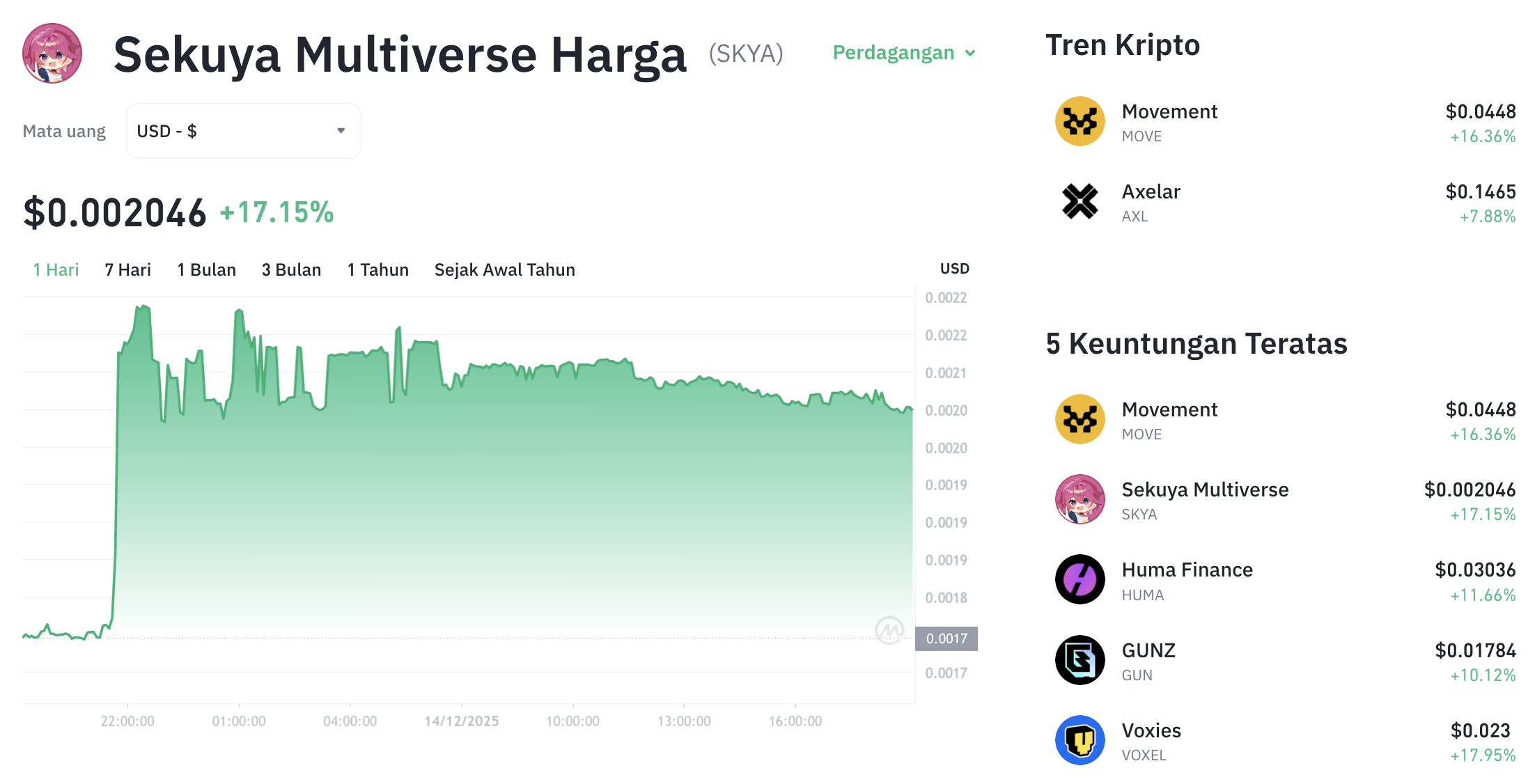 KabarTifa- Jakarta, 14 Desember 2025 – Pasar kripto kembali dihebohkan dengan pergerakan harga Sekuya Multiverse (SKYA) yang mendadak melonjak tajam hari ini. Setelah berbulan-bulan tertekan, token SKYA berhasil mencatatkan kenaikan impresif hampir 17% dalam 24 jam terakhir, diperdagangkan di kisaran $0,002056 per koin. Kenaikan signifikan ini sontak memicu spekulasi, apakah ini merupakan awal dari kebangkitan SKYA atau sekadar pantulan sesaat di tengah tren koreksi jangka menengah yang masih membayangi?