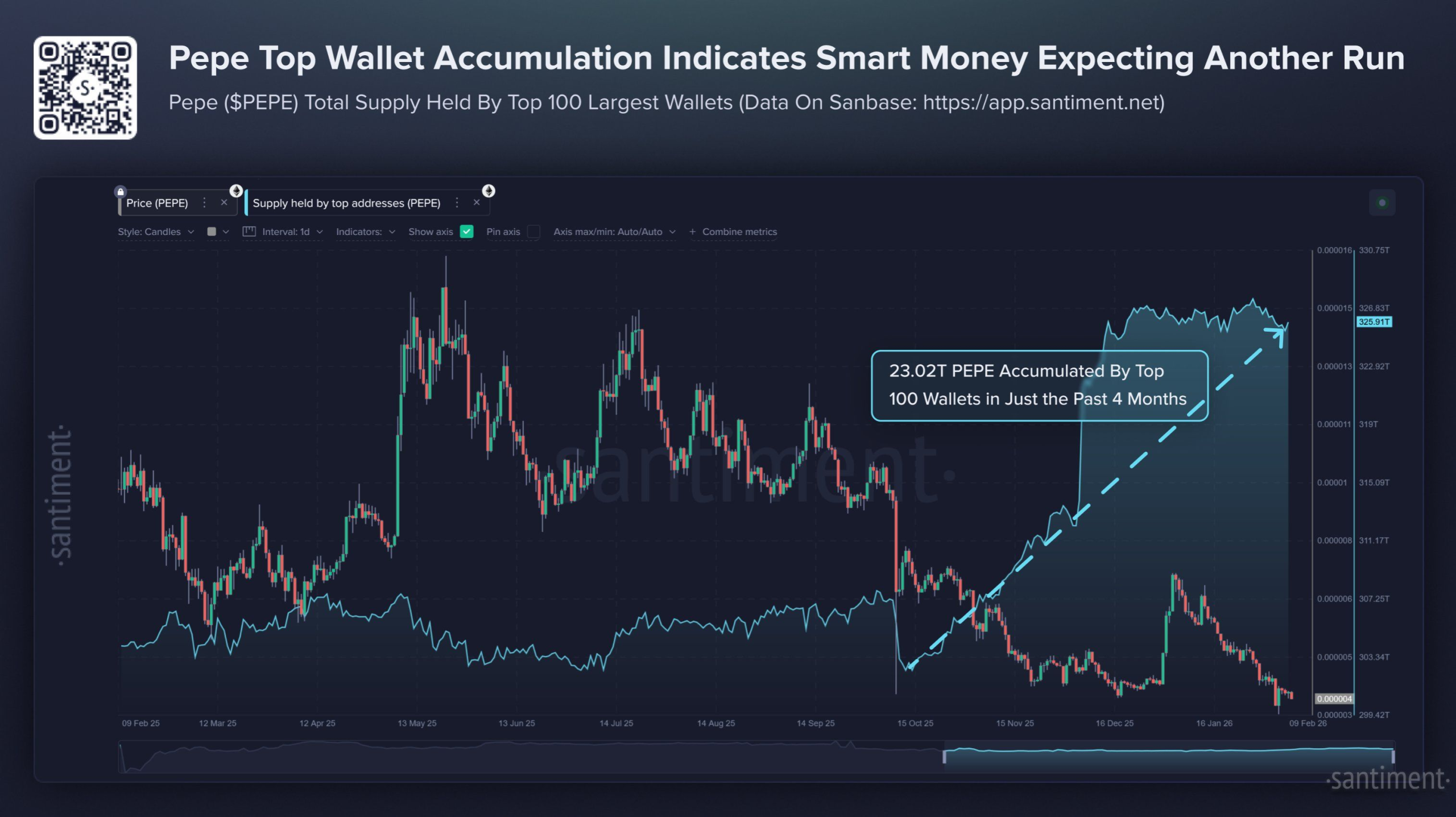 Analisis mendalam dari platform intelijen pasar Santiment menunjukkan bahwa 100 dompet terbesar pemegang PEPE telah menambah kepemilikan mereka secara signifikan. Tercatat, sekitar 23,02 triliun token PEPE telah diborong dalam kurun waktu empat bulan terakhir, terutama pasca-koreksi pasar yang dimulai sejak Oktober. Pergerakan ini kontras dengan sentimen pasar ritel yang cenderung pesimis terhadap sektor meme coin, mengindikasikan strategi yang berbeda antara investor institusional dan investor individu.