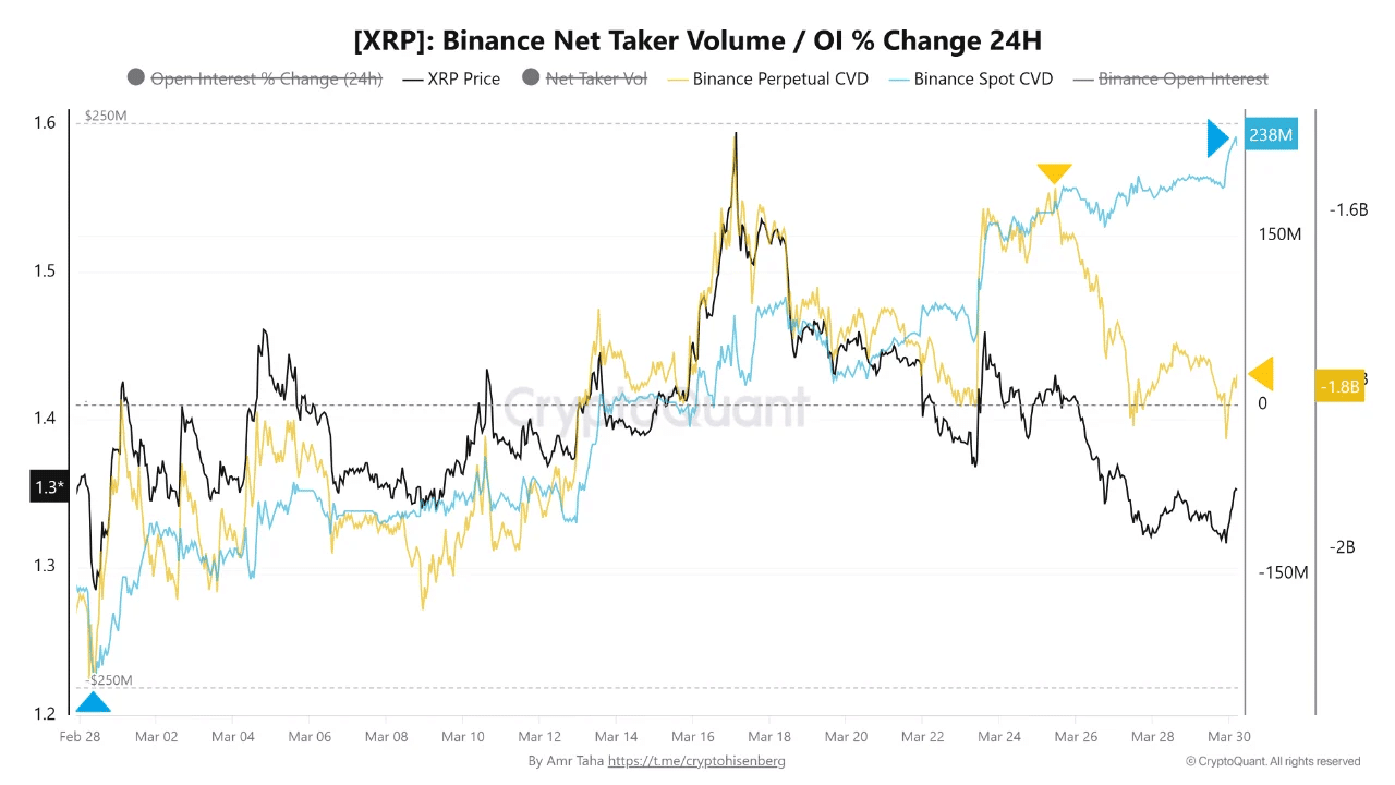 Menurut laporan terbaru dari analis pasar, permintaan di pasar spot XRP menunjukkan penguatan signifikan. Data Cumulative Volume Delta (CVD) Binance Spot melonjak drastis, bergeser dari sekitar -$250 juta pada akhir Februari menjadi +$238 juta di akhir Maret. Perubahan sebesar $488 juta ini secara jelas mengindikasikan lonjakan aktivitas beli, menandakan kembalinya minat investor untuk mengakumulasi XRP secara langsung. Kenaikan ini memberikan sinyal awal adanya kekuatan beli yang lebih dominan dibandingkan periode sebelumnya.