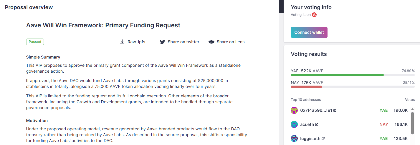 - Kepercayaan Tata Kelola: Dukungan komunitas yang masif (hampir 75%) menunjukkan konsensus yang kuat, memperkuat persepsi stabilitas dan arah strategis Aave di mata investor.