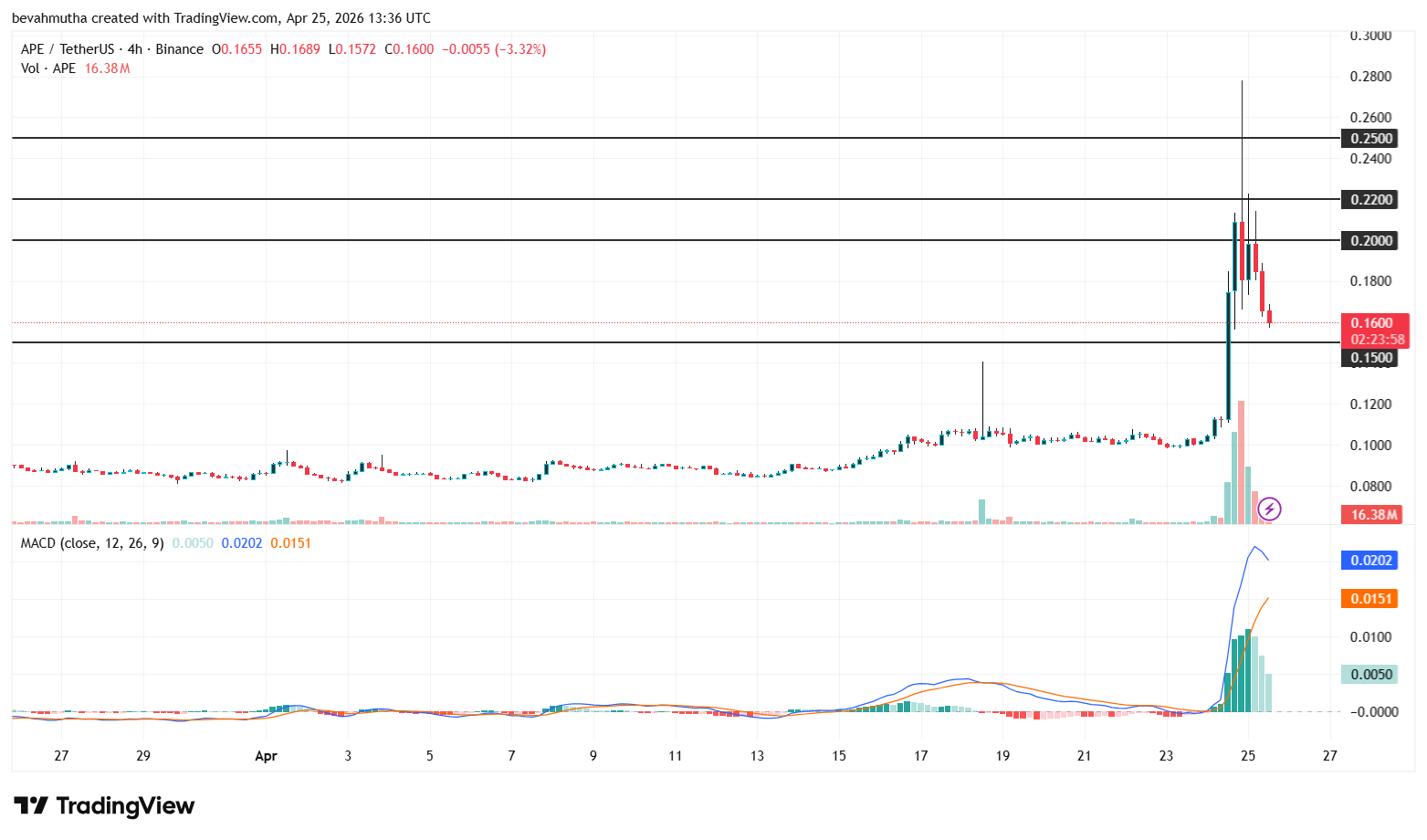 Dari perspektif analisis teknikal, APE kini berada di titik krusial setelah berhasil menembus tren turun jangka panjang. Level support penting berada di US$0,15. Jika level ini mampu dipertahankan, APE berpeluang menguji kembali US$0,20 dalam waktu dekat, bahkan berpotensi menembus US$0,22 untuk menuju US$0,25. Namun, indikator MACD menunjukkan perlambatan momentum, mengisyaratkan kemungkinan konsolidasi atau koreksi jangka pendek. Jika support US$0,15 jebol, APE bisa kembali ke zona konsolidasi sebelumnya di US$0,12.