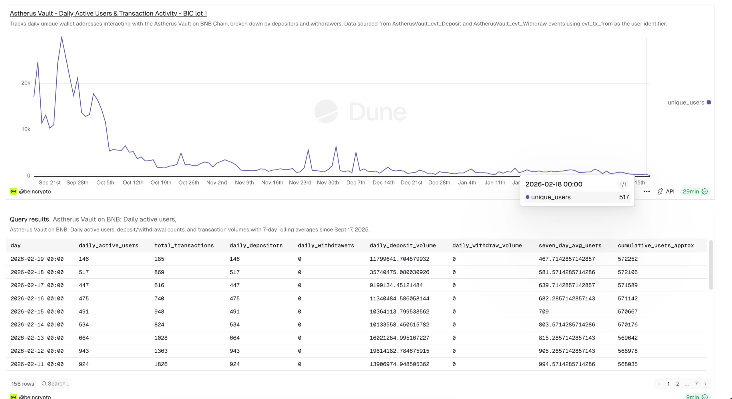 Menurut laporan dari BeInCrypto, data on-chain menunjukkan penurunan partisipasi pengguna yang sangat signifikan sejak token ini diluncurkan pada September 2025. Jumlah alamat aktif harian yang berinteraksi dengan Astherus Vault di BNB Chain sempat menyentuh angka 29.062 pada 24 September. Namun, per 19 Februari, angka tersebut terjun bebas menjadi hanya 146 alamat, menandai penurunan aktivitas harian sekitar 99,5%.
