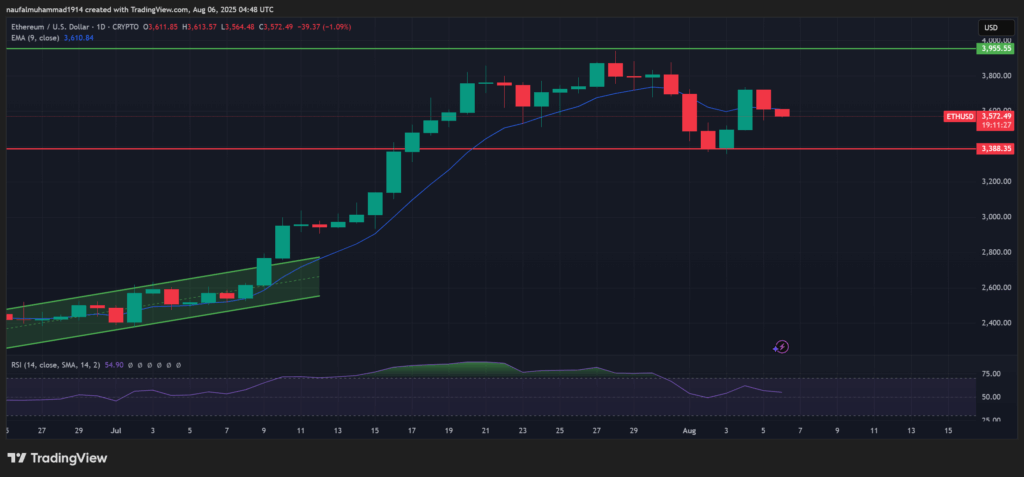 Ethereum (ETH): Ethereum diperdagangkan di sekitar $3.581, setelah gagal menembus resistensi $4.000. Kegagalan ini memicu koreksi harga dan mendorong ETH ke fase konsolidasi. Arus keluar dari pasar derivatif dan menurunnya minat beli memperkuat dominasi penjual. Indikator teknikal memberikan pertanda negatif, dengan pergerakan harga yang menjauhi rata-rata jangka pendek. Meskipun struktur jangka panjang masih dianggap bullish, ETH sedang mencari pijakan kuat di kisaran $3.500-$3.600. Jika tekanan jual meningkat, harga bisa turun mendekati $3.420. Namun, jika pembeli mampu menahan penurunan, potensi pemulihan jangka pendek tetap terbuka.