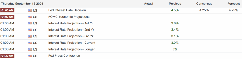 Pasar tengah fokus pada hasil rapat FOMC yang diumumkan pada 18 September 2025 pukul 01.00 WIB. Suku bunga acuan saat ini masih berada di 4,5%. Namun, banyak analis memperkirakan penurunan menjadi 4,25%. Jika benar terjadi, ini akan menjadi sinyal kebijakan moneter yang lebih longgar (dovish) dari The Fed, dan berpotensi menjadi katalis positif bagi aset berisiko seperti Bitcoin.