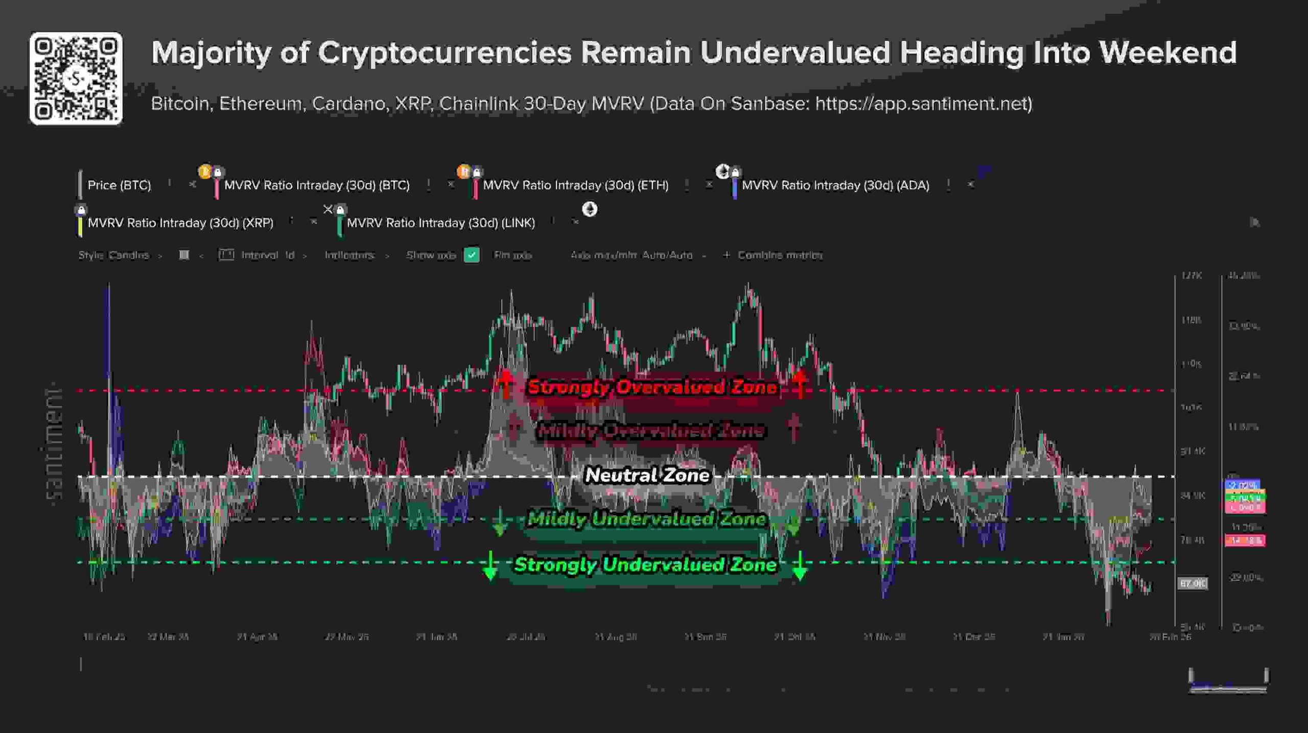 Angka negatif yang signifikan ini mengindikasikan bahwa sebagian besar investor saat ini berada dalam posisi rugi, sebuah kondisi yang secara historis sering muncul pada fase jenuh jual (oversold) dan berpotensi menjadi titik balik. Sebagai perbandingan, Bitcoin saat ini menunjukkan undervaluation sekitar 6,9%, Chainlink 5,1%, XRP 4,1%, dan Cardano 2%. Berdasarkan metrik ini, ETH tercatat sebagai aset dengan "diskon" terdalam di antara kripto utama dalam 30 hari terakhir.