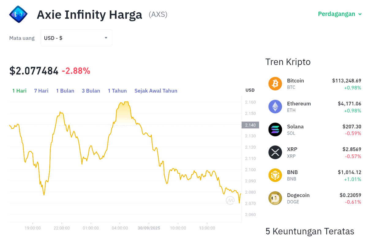 Meskipun saat ini AXS sedang berada dalam tren menurun, bukan berarti peluang untuk bangkit telah hilang. Beberapa faktor masih bisa menjadi katalis positif dalam jangka menengah hingga panjang. Harga Axie Infinity (AXS) saat ini berada di level $2,07, mencerminkan tekanan jual yang cukup besar dalam jangka pendek.