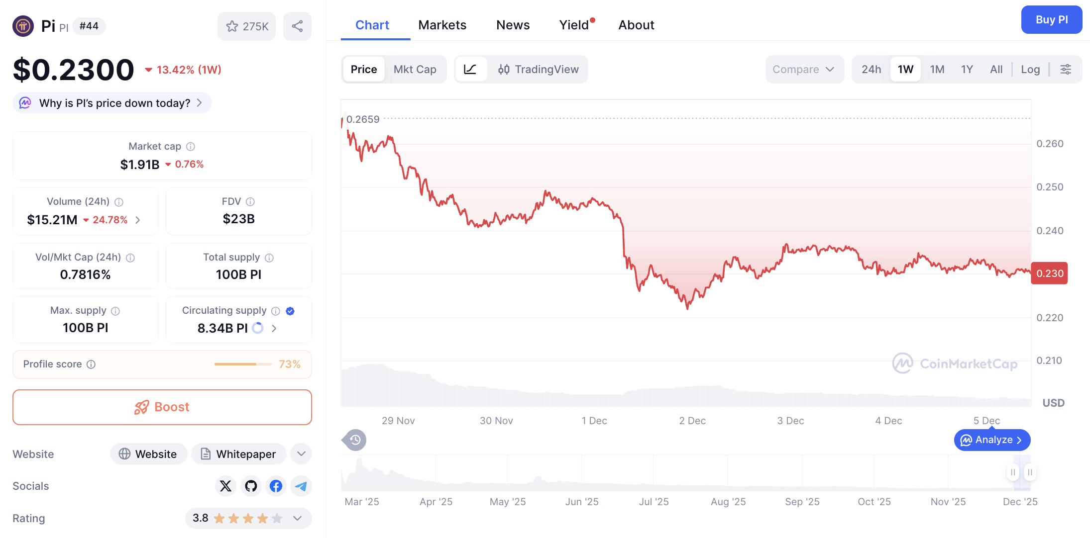 KabarTifa- Harga Pi Network (PI) kembali tertekan, mencatatkan penurunan sebesar 1,39% dalam 24 jam terakhir dan menyentuh level $0,231. Koreksi ini memperpanjang tren penurunan mingguan menjadi 15,98%, menjadikan PI sebagai salah satu altcoin dengan performa terburuk.