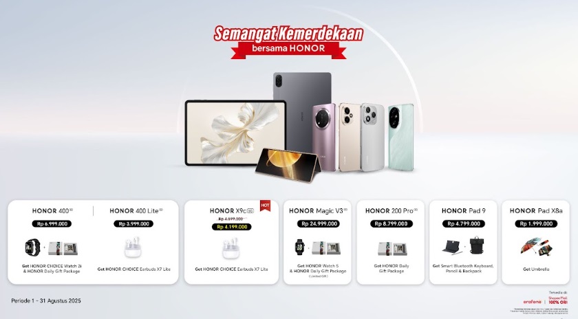 Sebagai puncaknya, HONOR memberikan bonus spesial kemerdekaan! Pembelian HONOR 400 hingga 17 Agustus 2025 mendapatkan HONOR Choice Watch 2i, paket hadiah harian, perlindungan layar 1 tahun, garansi tambahan 1 tahun, cicilan 0% hingga 24 bulan, dan cashback bank hingga Rp850.000. Sedangkan pembelian HONOR X9c hingga 31 Agustus 2025 mendapatkan cashback Rp400.000, HONOR Choice Earbuds X7, dan cicilan 0% hingga 24 bulan. Promo ini berlaku di Shopee, Eraspace, HONOR Experience Store, dan Erafone. Jangan lewatkan kesempatan emas ini!