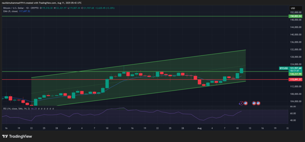Setelah pengumuman, harga Bitcoin melesat mendekati $124.000. Indikator teknikal menunjukkan momentum kenaikan yang berkelanjutan. Sentimen pasar optimis, terutama setelah beberapa pekan penguatan konsisten Bitcoin. Batas bawah harga di sekitar $120.000 menjadi area pertahanan penting. Penembusan di atas $124.000 dapat mendorong harga menuju $125.000 dalam jangka pendek.