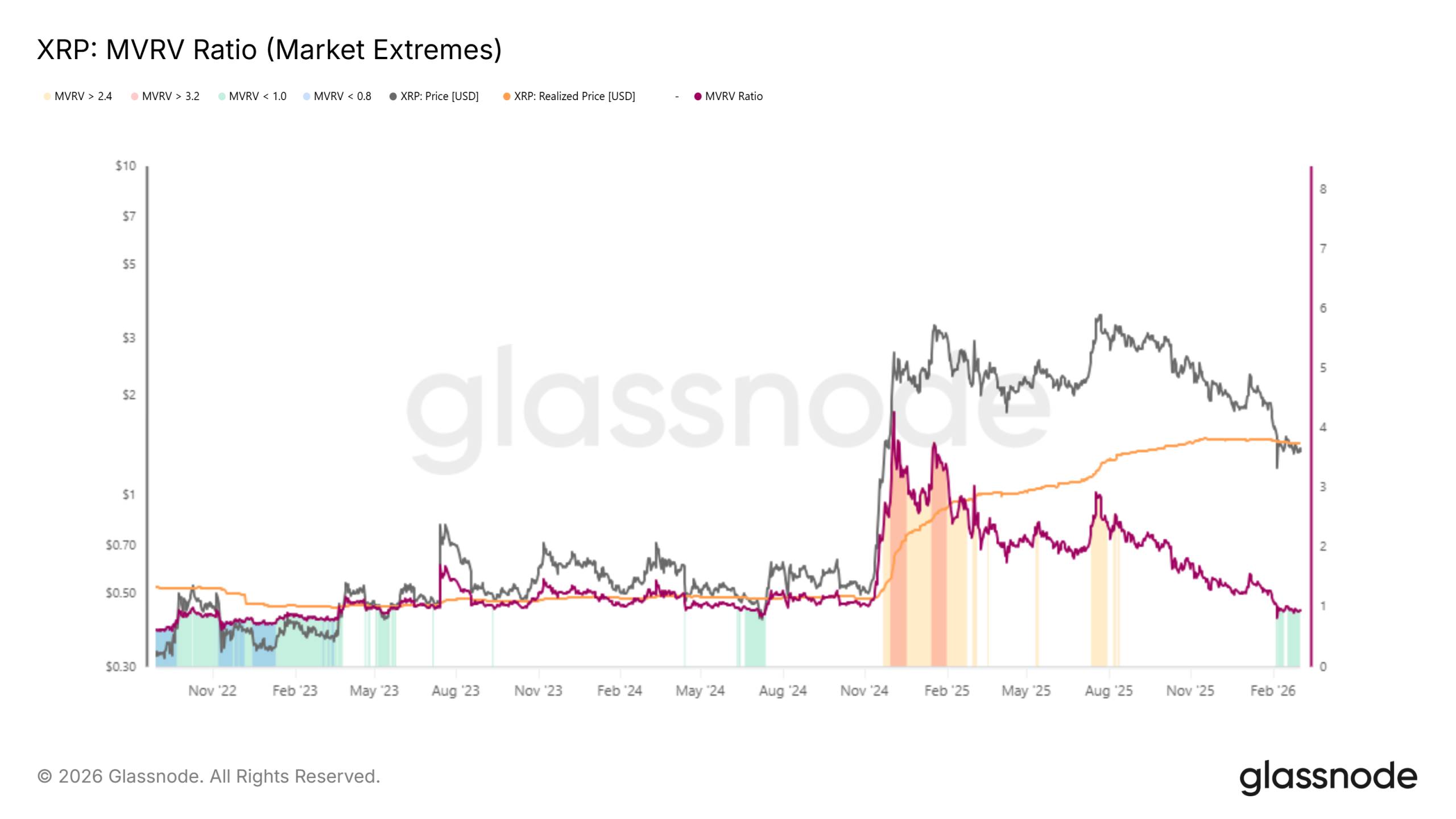 Salah satu indikator yang menjadi perhatian serius adalah MVRV Extreme Ratio, sebuah metrik yang membandingkan nilai pasar dengan nilai realisasi aset. Seperti yang dilaporkan oleh BeInCrypto, rasio MVRV XRP tercatat di bawah level 1,0 pada sekitar 15% dari total hari perdagangan. Kondisi ini sering diinterpretasikan sebagai tanda bahwa aset tersebut sedang undervalued, namun di sisi lain juga mencerminkan momentum pasar yang lesu.