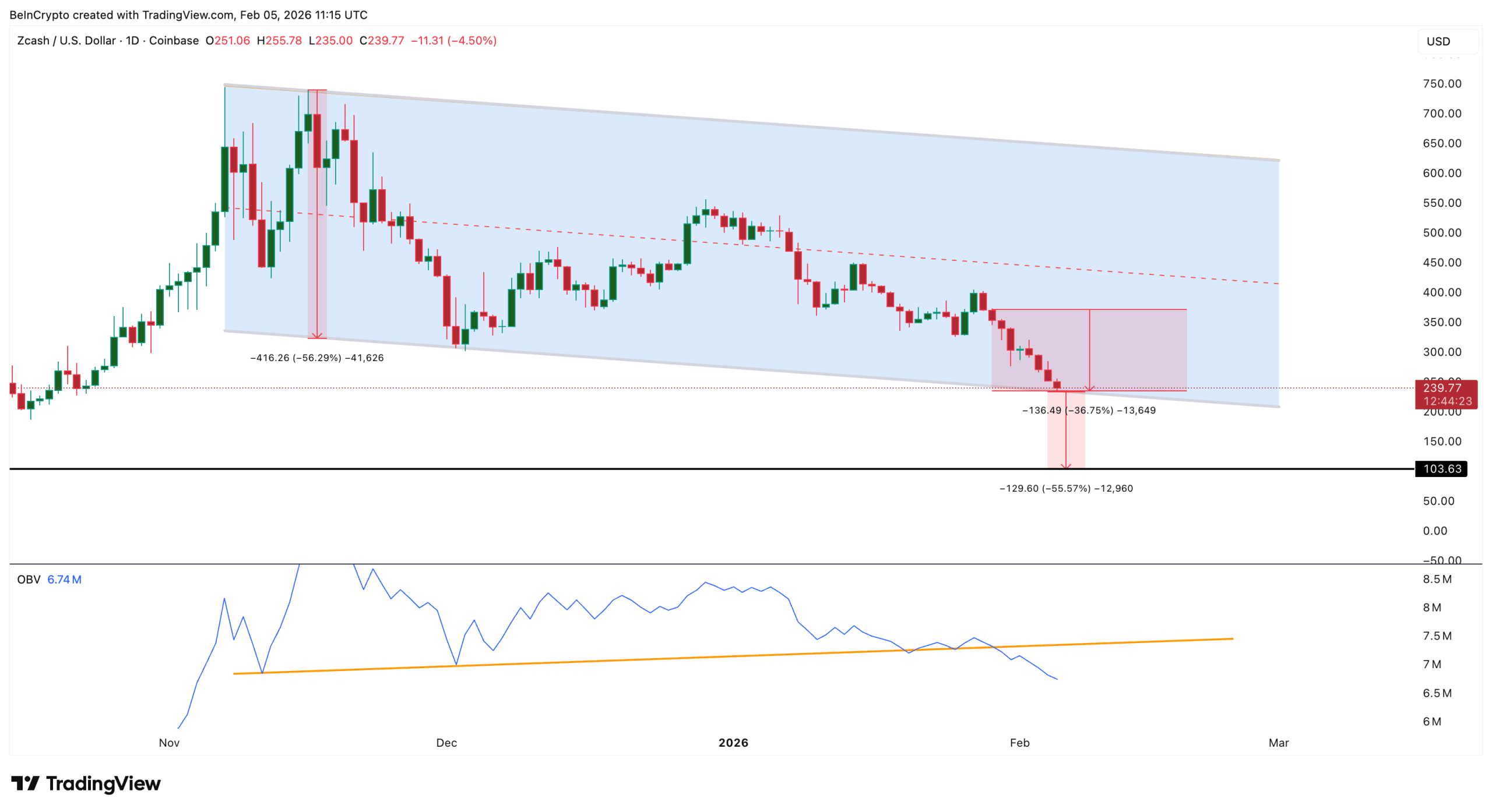 Tekanan jual ini semakin diperkuat oleh indikator On-Balance Volume (OBV). Meskipun sempat menunjukkan tren naik dari awal November hingga akhir Januari, yang mengindikasikan adanya akumulasi, dukungan tersebut akhirnya runtuh pada 29 Januari. Sejak breakdown OBV itu terjadi, Zcash dilaporkan telah merosot hampir 36%, sebuah sinyal kuat bahwa distribusi (penjualan) kian mendominasi pasar.